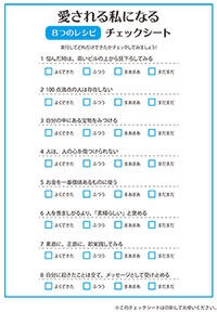 愛される私になるためのチェックシートです。8つのレシピがどれだけできるようになったかチェックしてみましょう。昨日できてなかったことが今日できるようになっているかもしれません。